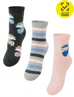Гладкие носочки для девочек с вывязанным рисунком "Единорожки". Двойной борт. Кеттельный шов. Цена указана за комплект - 3 пары.