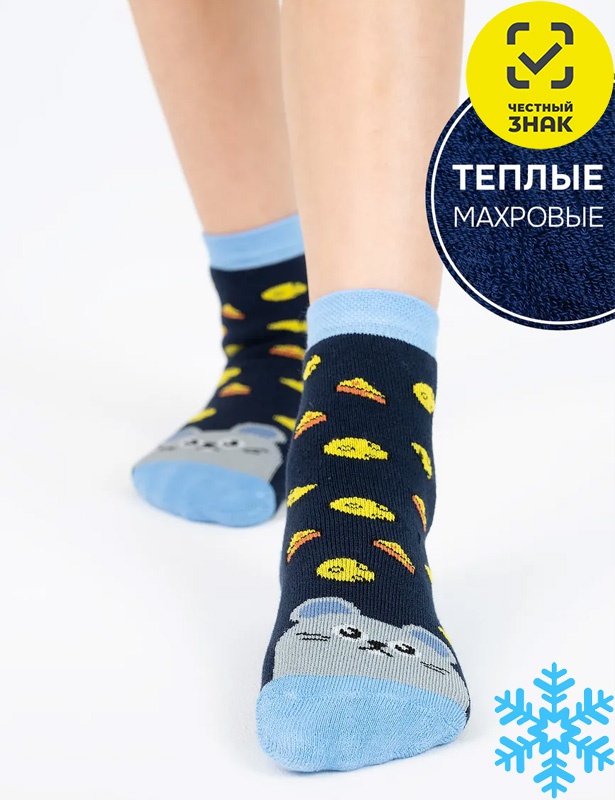 Забавные носочки с мышонком на мыске и сыром на паголенке понравятся как мальчикам, так и девочкам. Модель представлена в двух вариациях. В первом случае, мысок и манжет в едином сером цвете. Во втором, в ярко-желтом. Модель связана плюшевым переплетением из натурального хлопка, который обладает отличным согревающим свойством, поэтому даже в самые сильные зимние морозы ножка ребенка будет защищена.