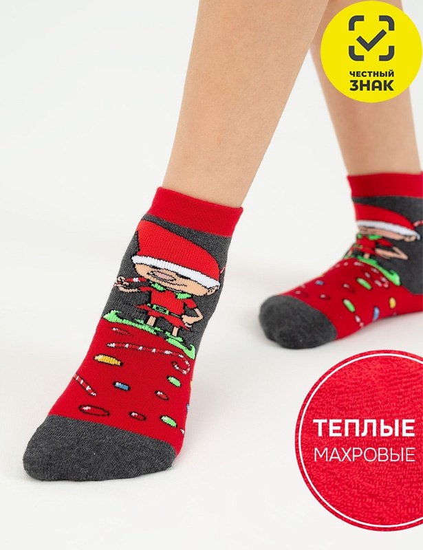 Любители сказок и волшебства будут в восторге от носочков с помощником Санты-Клауса – эльфом. На мыске также запечатлена россыпь желанных сладостей. Модель представлена в трех вариантах: в красно-сером, бирюзово-сером и сине-голубом. Такой выбор позволит наверняка найти нужную пару для ребенка. Носочки связаны из натурального хлопка, который обладает отличным согревающим свойством, поэтому даже в зимние морозы ножка будет защищена.