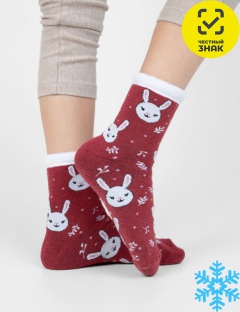 Детские носочки с новогодним дизайном. Теплая модель из натурального гребенного хлопка – находка для холодного сезона, в таких носочках комфортно, тепло и уютно. Рисунок забавного зайца поднимет настроение как взрослому, так и ребенку, а плюшевый бортик на лицевой стороне добавит мягкости. Теплые носочки станут приятным дополнением к новогоднему подарку.