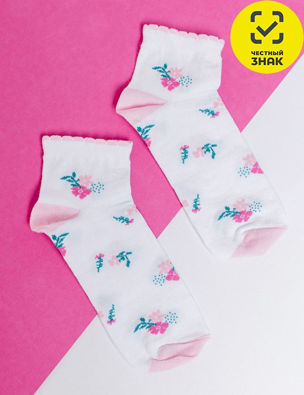 Детские носки бело-розовые с двубортной резинкой, ажурные с фистонами, паголенок средней высоты. Цветочный рисунок. После стирки не теряют цвет и форму. Цена указана за 1 пару, продажа осуществляется упаковками, 6 шт в упаковке.