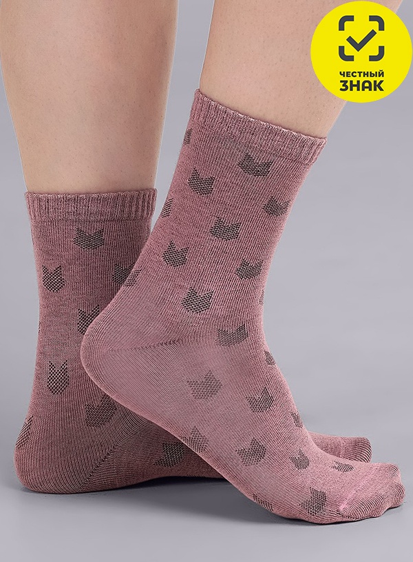 Носки для девочки с вывязанным рисунком кошки безниточной технологией. Двубортная резинка, усиленный мысок и пятка.