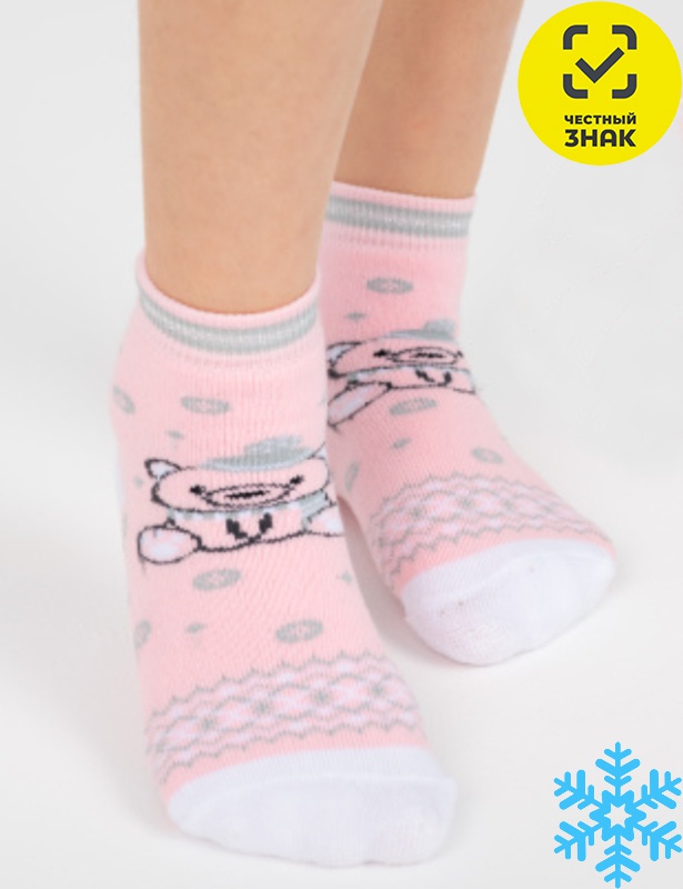 Милые носочки для девочки с изображением мишки в шапке и шарфе, махра внутри. Борт модели украшен нитями люрекса. Натуральный хлопок, из которого изготовлены носочки отлично впитывает влагу, удобен в носке, дарит ощущение легкости и защищает от холода.