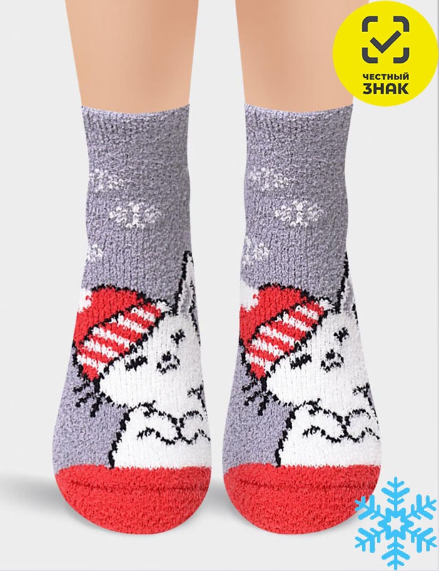 Детские новогодние носки из мягкой "травки" с рисунком зайца.