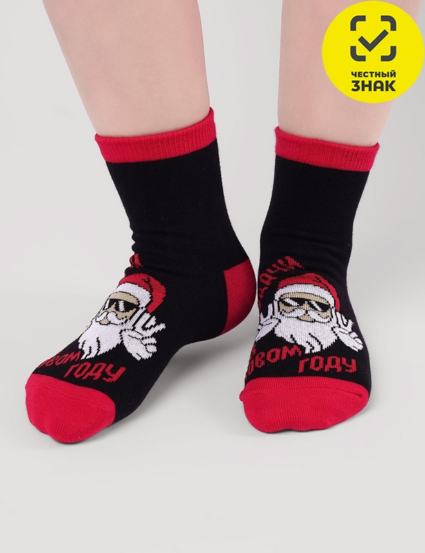 Детские носки с выделенным мыском, пяткой и бортом, с рисунком лицо деда мороза и надписью удачи в новом году.
