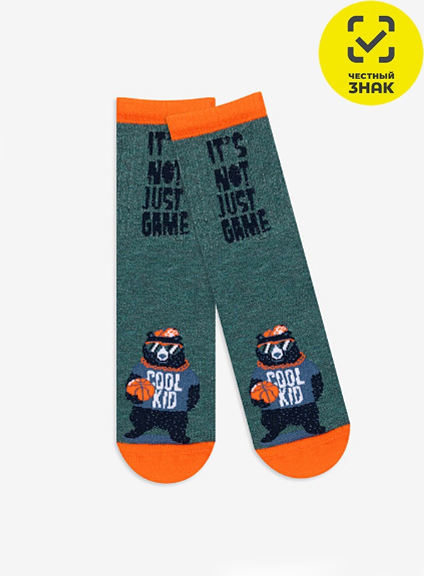 Детские носки с рисунком. Модель связана из натурального гребенного хлопка, благодаря этому обладает повышенной мягкостью, воздухопроницаемостью, защищает ножки от раздражения и дискомфорта в течение дня. Особенностью изделия является широкая спортивная резинка, которая не перетягивают и не сползает, обеспечивая поддержку при активных занятиях спортом. Носки в ярких цветах с рисунком креативного медведя – баскетболиста и надписью на паголенке «It's not just game» - это то, что оценят, как дети, так и взрослые.