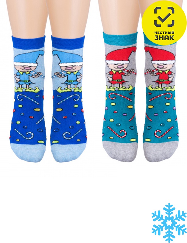 Любители сказок и волшебства будут в восторге от носочков с помощником Санты-Клауса – эльфом. На мыске также запечатлена россыпь желанных сладостей. Модель представлена в трех вариантах: в красно-сером, бирюзово-сером и сине-голубом. Такой выбор позволит наверняка найти нужную пару для ребенка. Носочки связаны из натурального хлопка, который обладает отличным согревающим свойством, поэтому даже в зимние морозы ножка будет защищена.