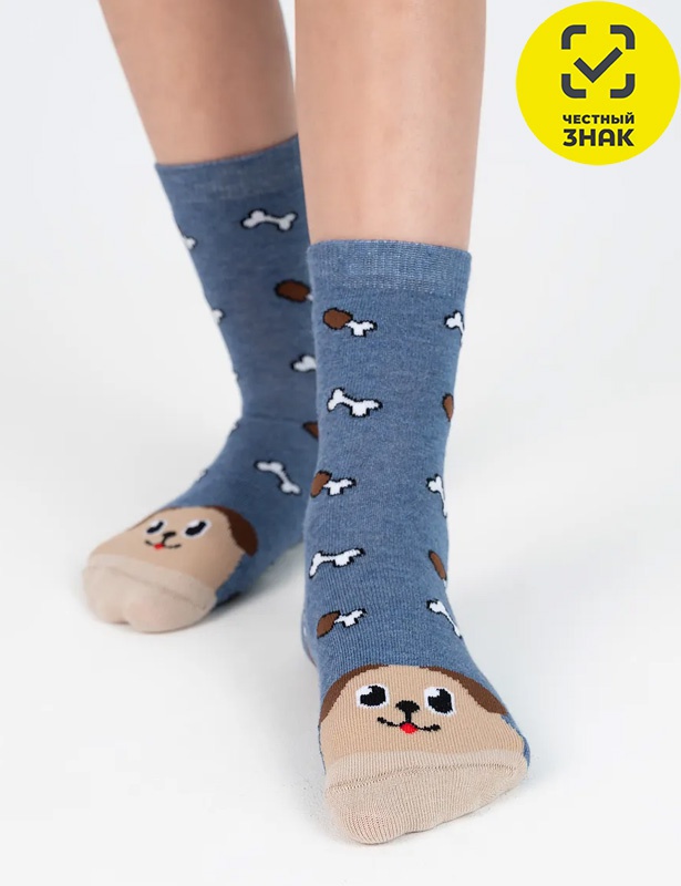 Носки детские с провязаным рисунком "собачка" на мыске и "косточки" по всей поверхности носка.