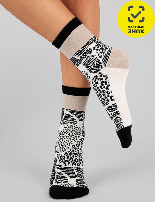 Демисезонные женские носки. Модель связана из натурального гребенного хлопка и подходит для повседневной носки. Двубортная резинка мягко облегает ногу, не доставляя дискомфорт. Декорированы интересным принтом.