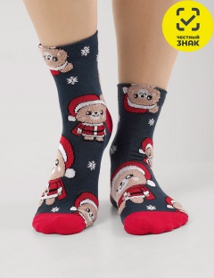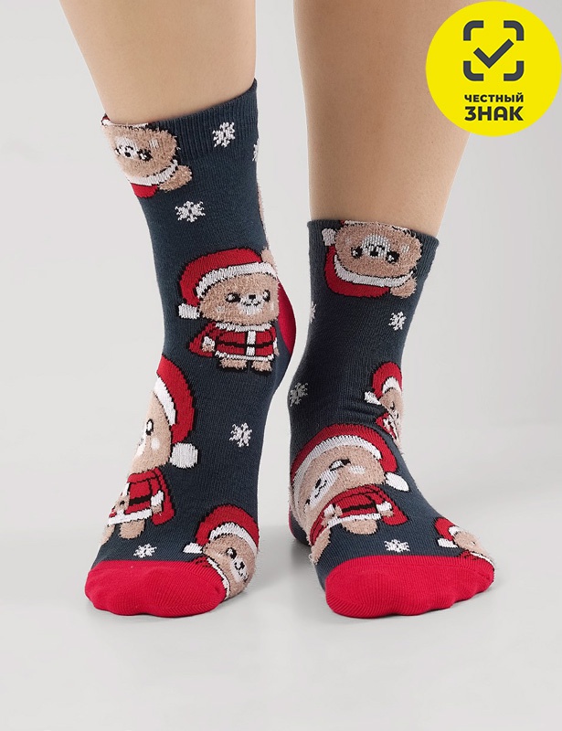 Носки женские с рисунком мишек в новогоднем костюме, мишка выполнен из пряжи травка