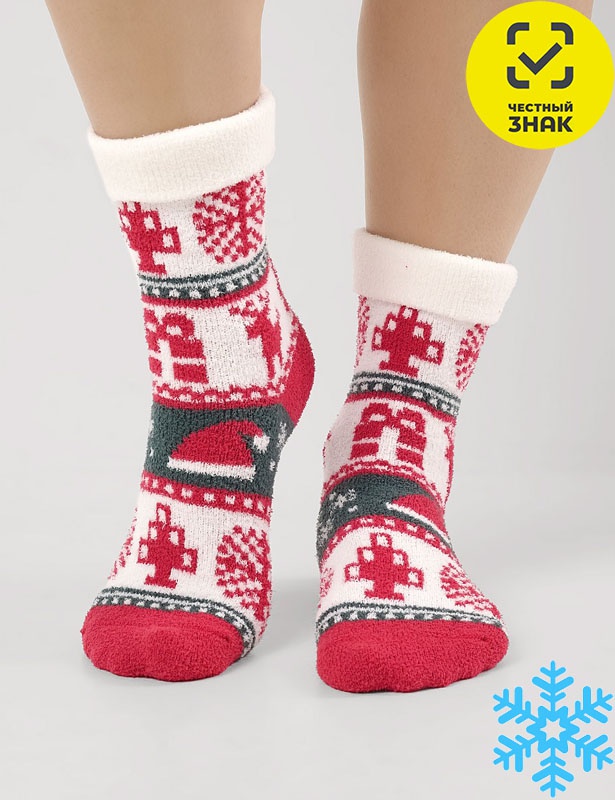 Новогодние женские носки-сапожки из мягкой пряжи травка со скандинавским орнаментом