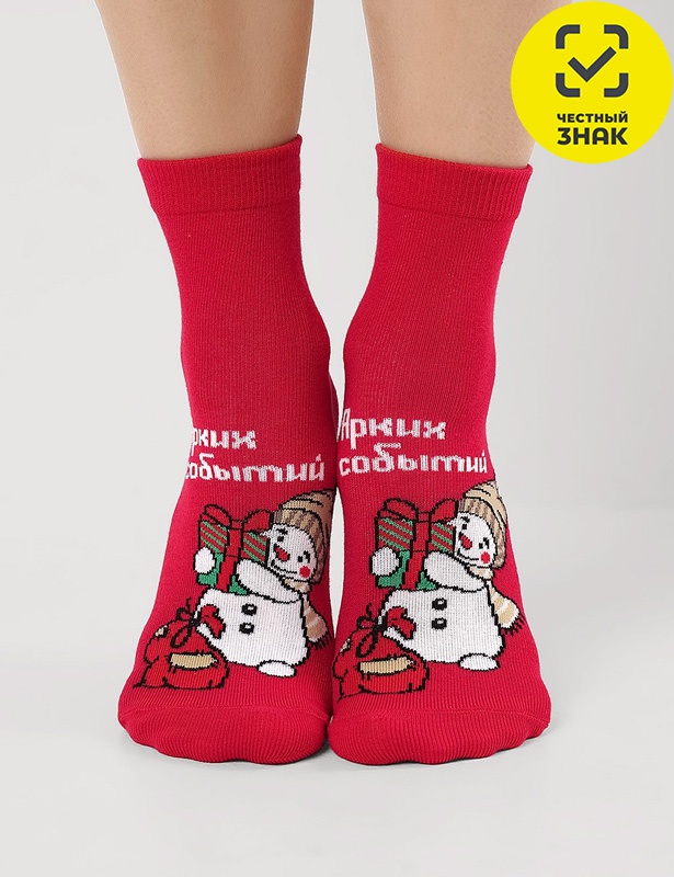 Носки женские с рисунком Снеговик с подарками и надписью Ярких событий!