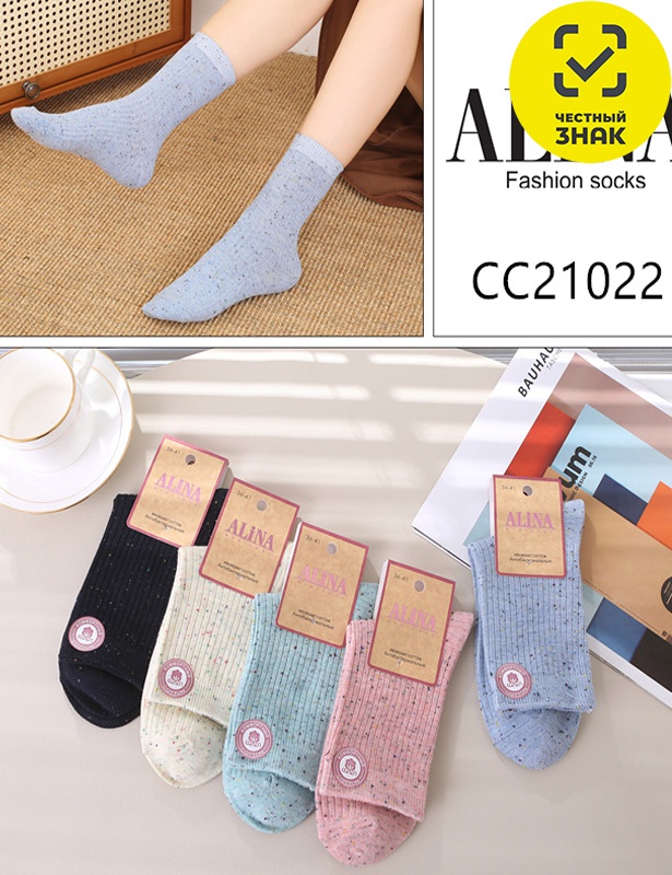 Производитель: ТМ Алина Артикул: CC21022 носки женские Пол: ЖЕНСКИЙ Полотно: лапша Состав: 80% хб, 13% па, 7% эл Возраст: взросл