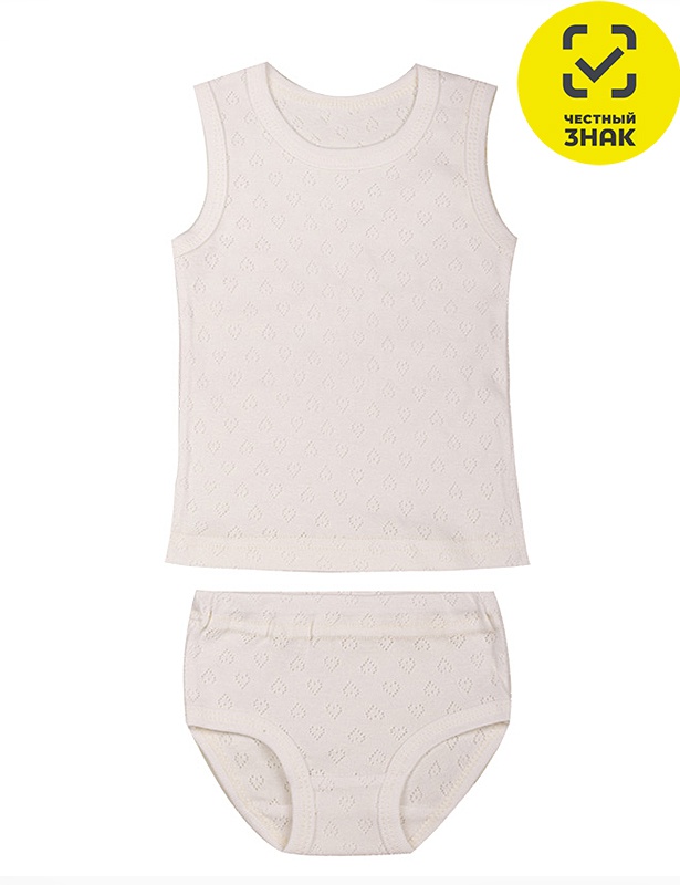 Комплект для девочки. Майка из ажурной рибаны, края обработаны рибаной хб. Трусы из ажурной рибаны с эластичной тесьмой в поясе, нижние срезы обработаны рибаной хб.