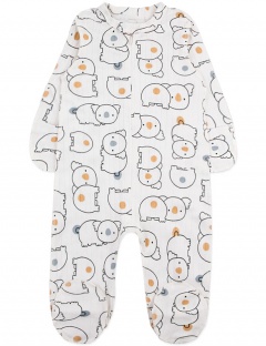 Комбинезон для новорожденного из набивного интерлока, длинный закрытый рукав, закрытая ножка, центральная застежка на молнию, ворот окантован и с застежкой на кнопку.