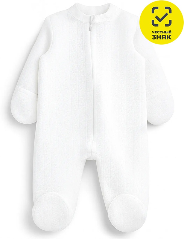 Комбинезон для новорожденного из гладкокрашеного интерлока, длинный закрытый рукав, закрытая ножка, центральная застежка на молнию, ворот окантован и с застежкой на кнопку.