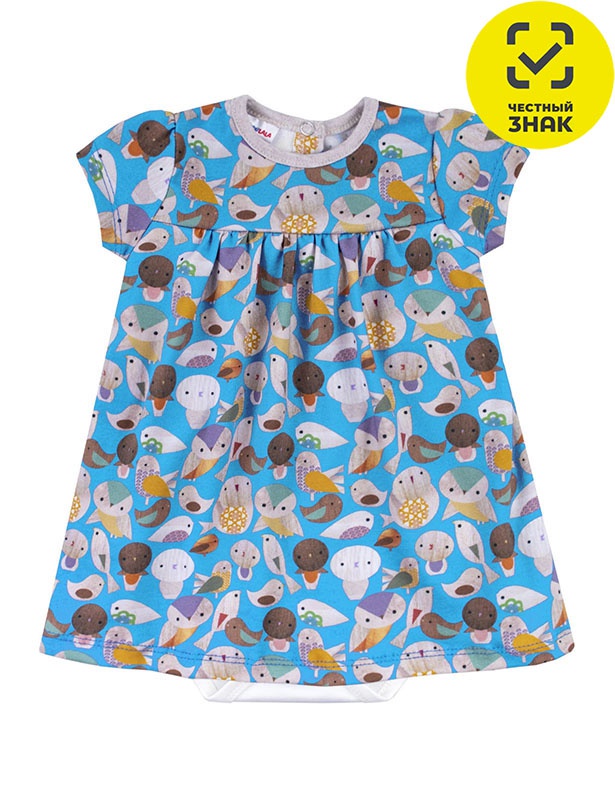 Платье-боди ясельное из набивного полотна, отрезное на груди со сборками, короткие втачные рукава, округлая горловина с застежкой на кнопки по спинке.
