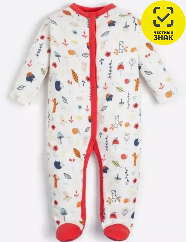 Комбинезон ясельный из набивного полотна, длинные рукава на манжетах, застежка на кнопки по центру и шаговому шву, воротник окантован, закрытые ножки.