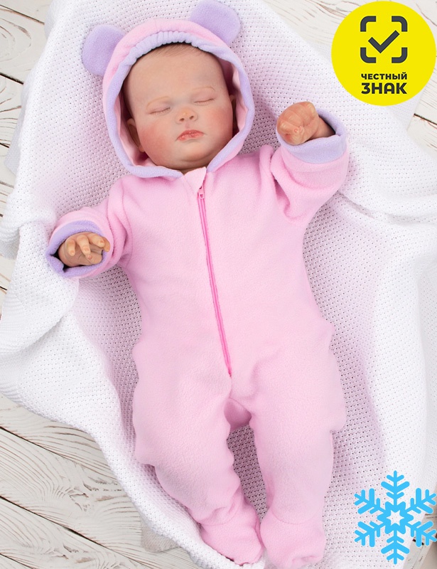 Комбинезон ясельный из флиса, с капюшоном, длинный втачной рукав, ассиметричная застежка на молнию, закрытая ножка. Капюшон и рукава окантованы флисом в комби-цвете.