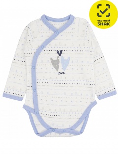 Полукомбинезон (боди) ясельный из интерлока, застежка асимметричная спереди и по низу изделия на кнопки. Рукав втачной длинный, печать спереди. Горловина, рукава и низ изделия окантованы.