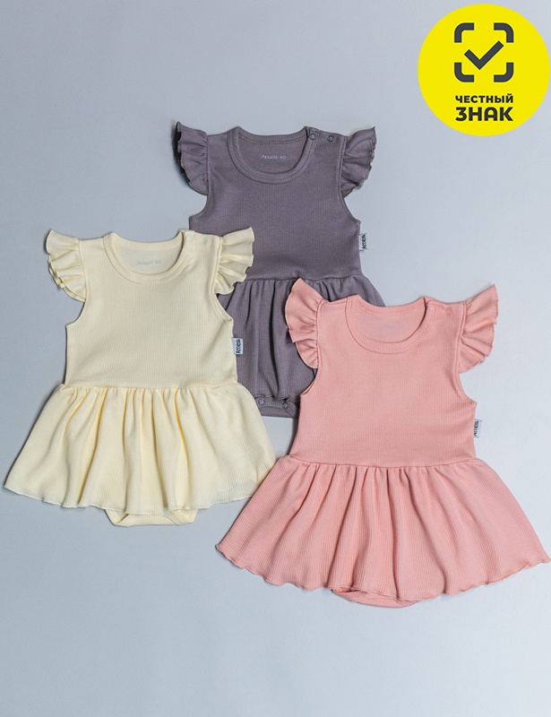 Боди-платье ясельное, с короткими рукавами-крылышко и юбкой. Низ рукавов и юбки обработан спиральным швом. По низу изделия застежка на кнопки.