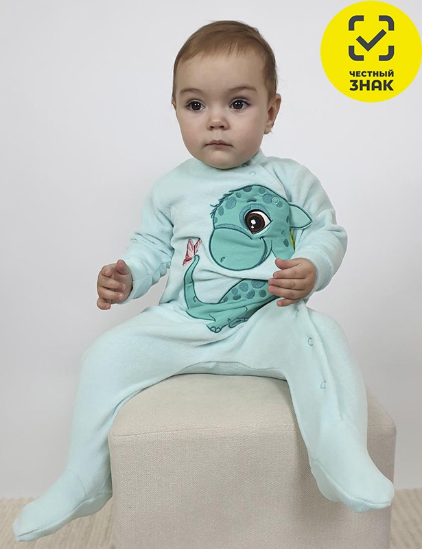 Комбинезон ясельный из велюра, правая сторона переда с вышивкой-аппликацией. Рукав втачной длинный на манжете, в горловине воротник-стойка. Застежка ассиметричная на кнопки.