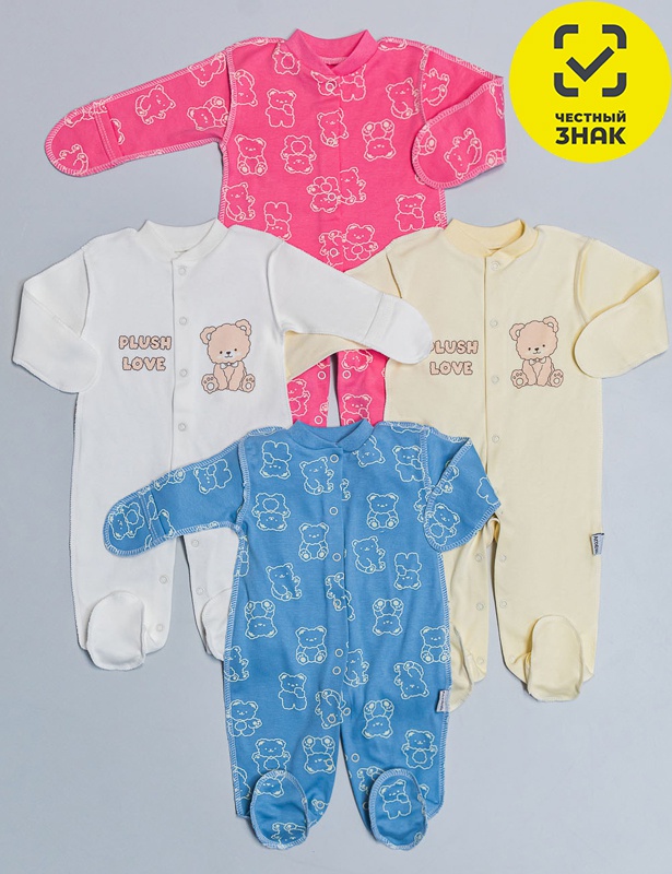 Комбинезон с наружными швами, с закрытыми ножками, рукавами реглан с распашными полочками и ножками на кнопках с комбинированными полочками, рукавами-царапками и полулапками с ластовицей и принтом.