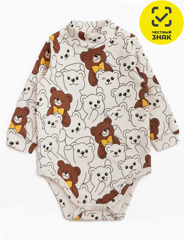 Боди ясельное из набивного полотна интерлока, с длинными втачными рукавами с манжетами, застежка на кнопки, горловина «гольф».