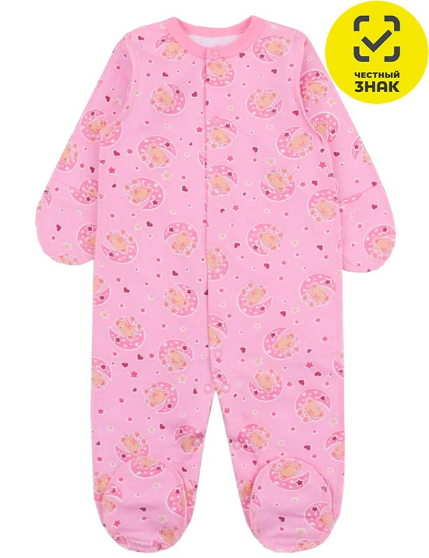 Комбинезон для новорожденного из набивного полотна, длинный закрытый рукав, закрытая ножка, центральная застежка на кнопки, ворот окантован и с застежкой на кнопку.