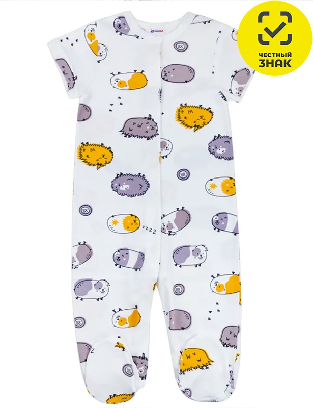 Комбинезон из набивного интерлока, с короткими рукавами, закрытыми ножками и центральной застежкой на кнопки.