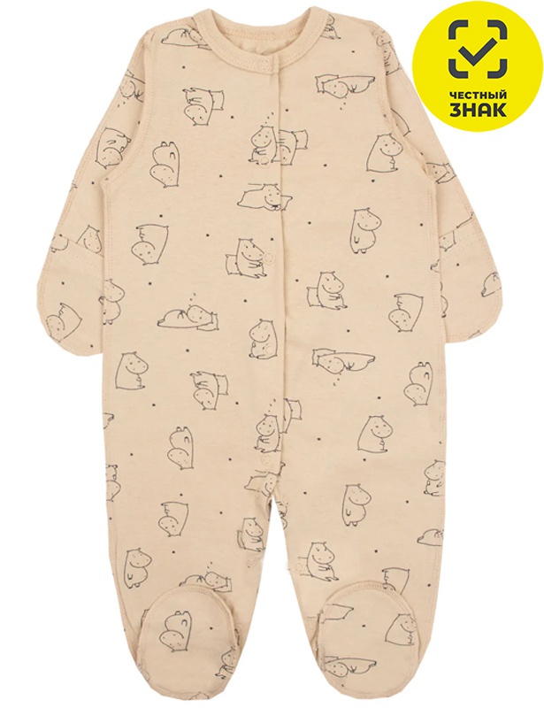 Комбинезон для новорожденного из набивного полотна, длинный закрытый рукав, закрытая ножка, центральная застежка на кнопки, ворот окантован и с застежкой на кнопку.