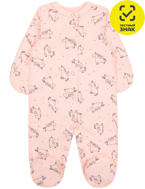 Комбинезон для новорожденного из набивного полотна, длинный закрытый рукав, закрытая ножка, центральная застежка на кнопки, ворот окантован и с застежкой на кнопку.