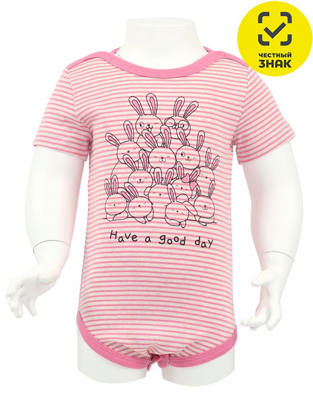 Боди с застежкой на кнопки с двух сторон горловины и коротким рукавом. Горловина и плечевые срезы, а также срезы пройм ножек окантованы бейкой из основного полотна. В нижней части боди обработана застежка на кнопки. На полочке выполнена шелкография мягкими красками. Второй цветовой вариант из полотна в мелкую вязанную из крашеной пряжи полоску, остальные гладкокрашенные.
