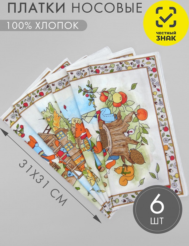 Платок носовой размером 31*31 см. Цена за упаковку, продажа по оптовым ценам осуществляется упаковками, 6 шт в упаковке.
