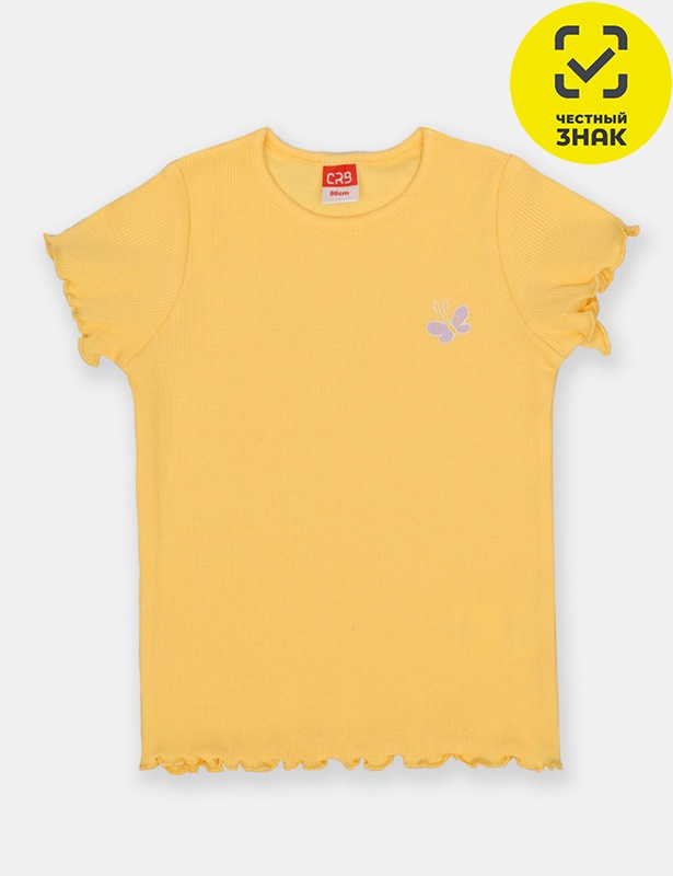 Футболка для девочки из мягкого трикотажа в рубчик. Горловина круглая. На плече застежка на кнопки. Край рукава и низ изделия слегка волнистый, что придает более игривый вид. На полочке расположена шелкография в виде бабочки.
