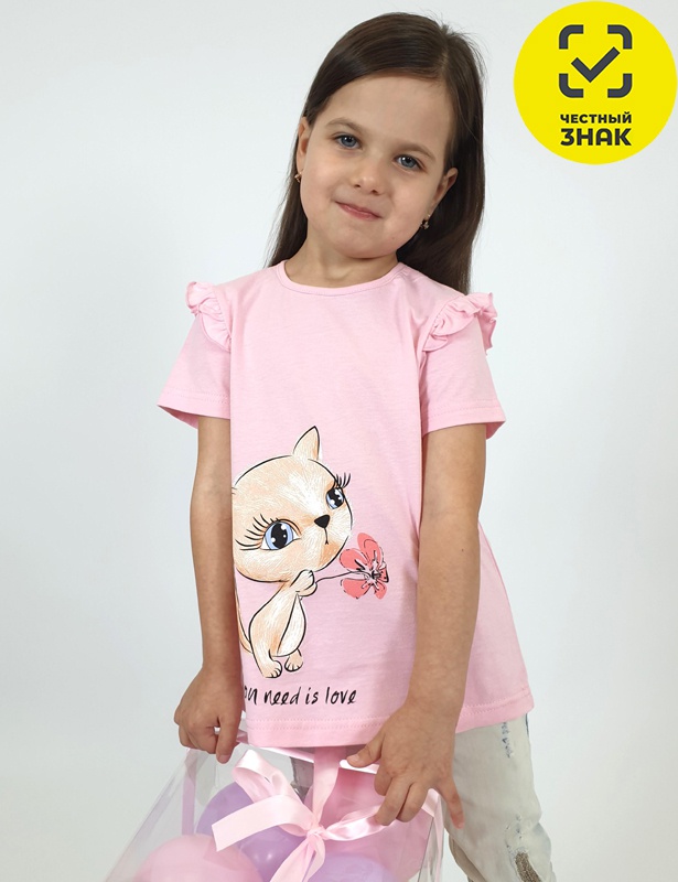 Футболка для девочки - силуэт трапеция, короткий втачной рукав, в пройме рюша. Горловина окантована, застежка на пуговицу по спинке. Печать на полочке
