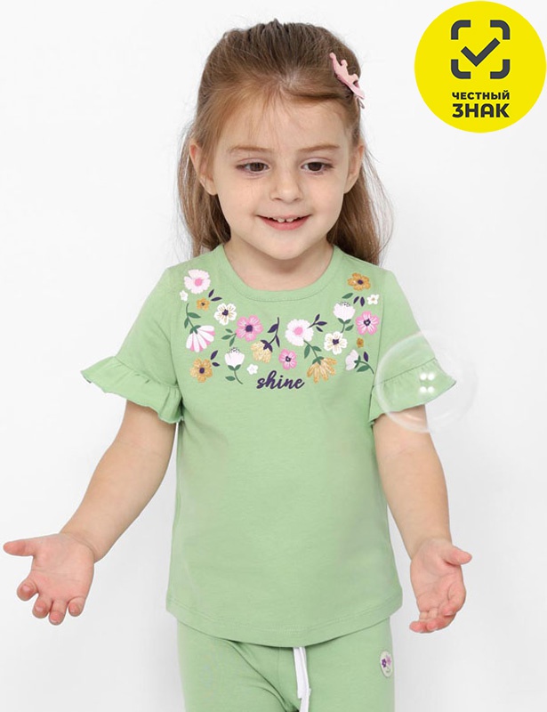 Футболка для девочки с короткими рукавами и принтом в верхней части переда. Горловина окантована бейкой из основного полотна. Рукава декорированы притачными оборками.