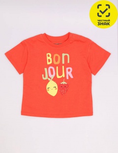 Футболка для девочки из мягкого трикотажа. Горловина круглая, оформлена кашкорсе. На плече застежка на кнопки. Силуэт свободный со спущенным плечом. На полочке выполнена шелкография в виде фруктов и надпись - приветствие.