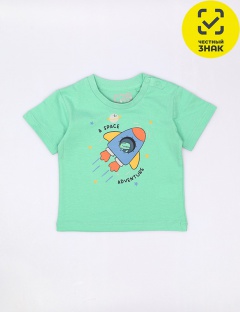 Футболка для мальчика свободного силуэта из мягкого трикотажа. Горловина круглая, оформлена рибаной, по плечу застежка на кнопки. На полочке выполнена шелкография - ракета с динозавром. Надпись на английском - космическое приключение.