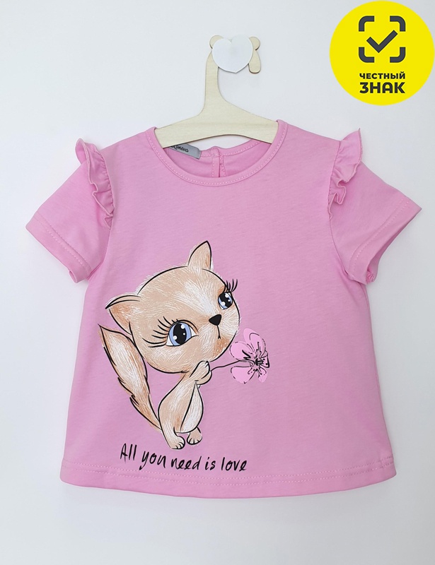 Футболка для девочки - силуэт трапеция, короткий втачной рукав, в пройме рюша. Горловина окантована, застежка на пуговицу по спинке. Печать на полочке
