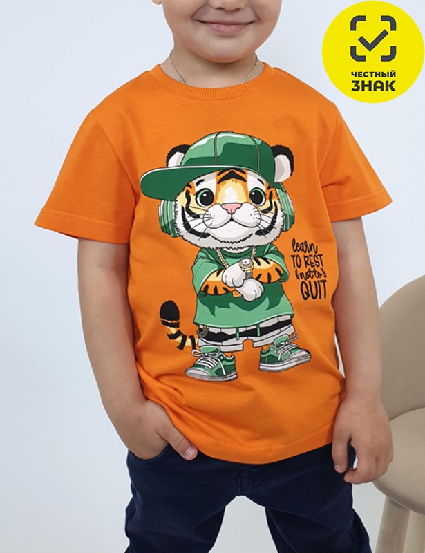 Футболка для мальчика имеет прямой силуэт, короткий втачной рукав и горловину, обработанную ластиком. На передней части футболки расположена печать.