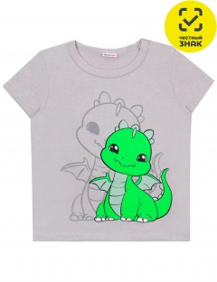 Футболка из гладкокрашеного полотна с принтом на полочке, короткие втачные рукава, округлый вырез горловины, окантованный бейкой из основного полотна, застежка по плечу на кнопки.