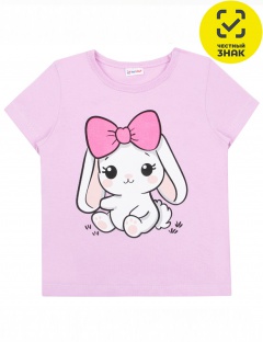 Футболка из гладкокрашеного полотна с принтом на полочке, короткие втачные рукава, округлый вырез горловины, окантованный бейкой из основного полотна, застежка по плечу на кнопки.