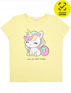 Футболка из гладкокрашеного полотна с принтом на полочке, короткие втачные рукава, округлый вырез горловины, окантованный бейкой из основного полотна, застежка по плечу на кнопки.