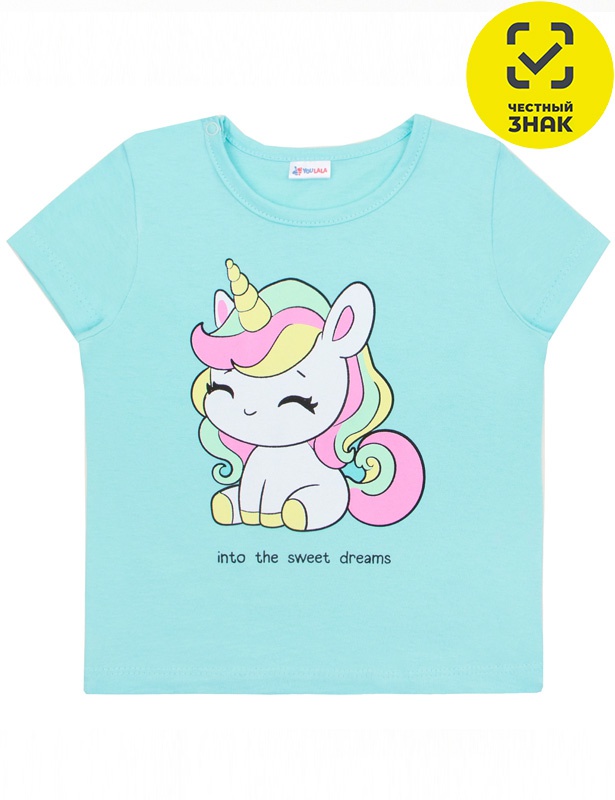 Футболка из гладкокрашеного полотна с принтом на полочке, короткие втачные рукава, округлый вырез горловины, окантованный бейкой из основного полотна, застежка по плечу на кнопки.