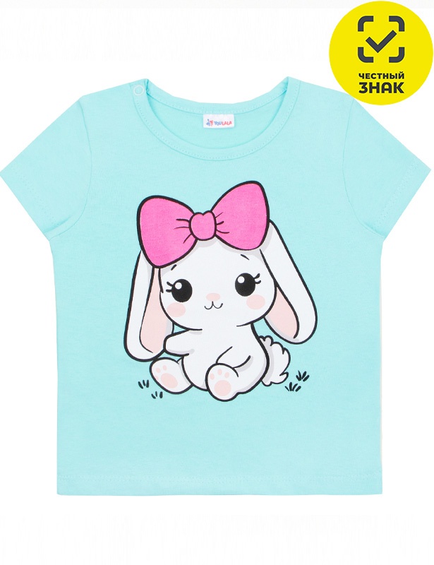 Футболка из гладкокрашеного полотна с принтом на полочке, короткие втачные рукава, округлый вырез горловины, окантованный бейкой из основного полотна, застежка по плечу на кнопки.