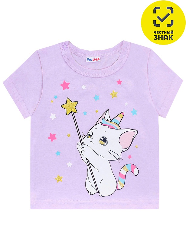 Футболка из гладкокрашеного полотна с принтом на полочке, короткие втачные рукава, округлый вырез горловины, окантованный бейкой из основного полотна, застежка по плечу на кнопки.