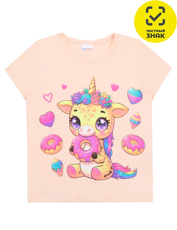 Футболка из гладкокрашеного полотна с принтом на полочке, короткие втачные рукава, округлый вырез горловины, окантованный бейкой из основного полотна, застежка по плечу на кнопки.