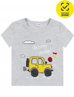 Футболка ясельная из гладкокрашеного полотна, короткие втачные рукава, округлый вырез горловины, окантованный бейкой из основного полотна, застежка по плечу на кнопки, на полочке печать.