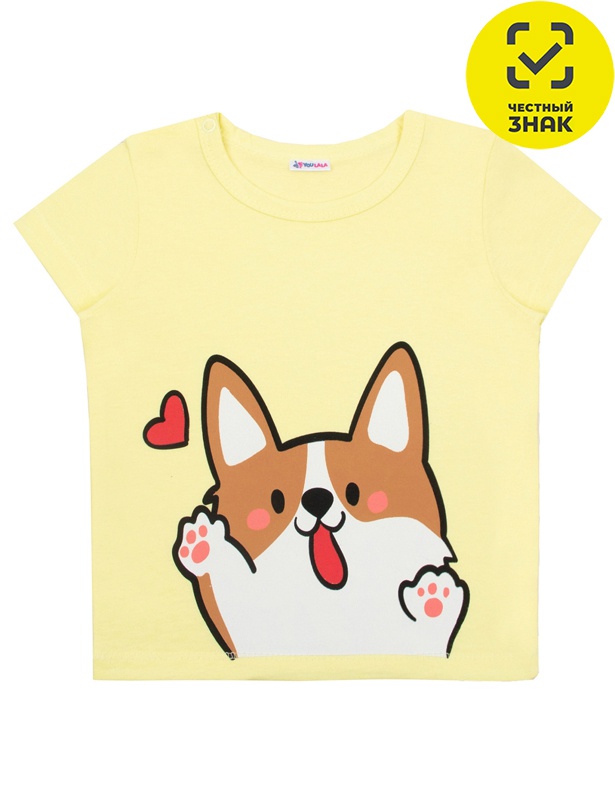Футболка из гладкокрашеного полотна с принтом на полочке, короткие втачные рукава, округлый вырез горловины, окантованный бейкой из основного полотна, застежка по плечу на кнопки.